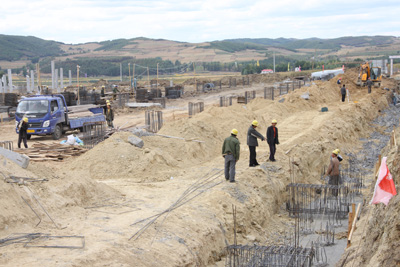 在牡丹江市郊東北、G11國道西側(cè),有一處破土動工的工業(yè)園區(qū),這里彩旗招展,機械隆隆,此地就是牡丹江市對俄經(jīng)濟開發(fā)區(qū)光伏產(chǎn)業(yè)園區(qū)建設現(xiàn)場,數(shù)家施工企業(yè)在這塊十幾萬平方公里的戰(zhàn)場上相互比拼。由我公司承建的光伏園區(qū)8號標準化廠房,正以前所未有的速度加緊施工。該工程建筑面積為20880平方米,于2011年8月15日開工。